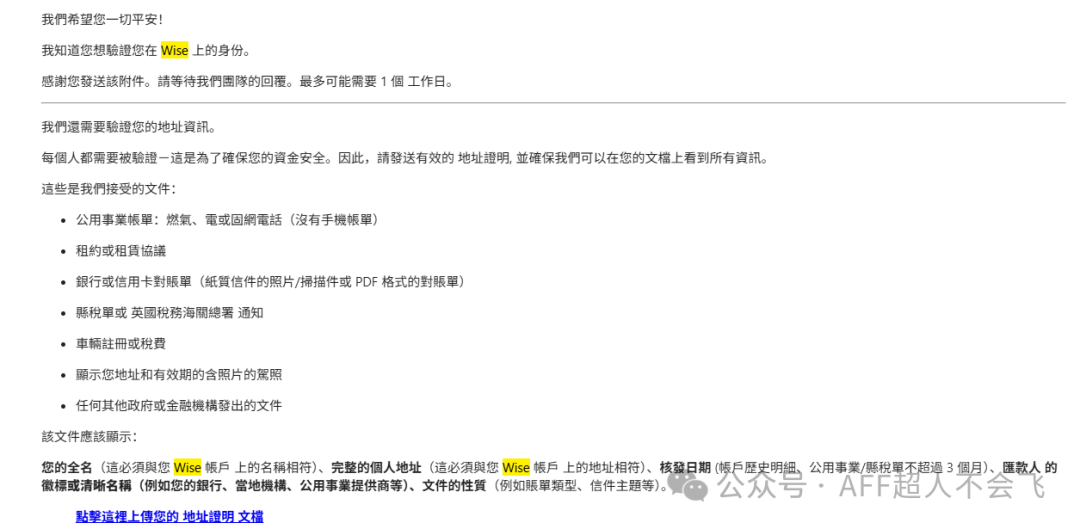 非常高兴,我按要求拍照发送过去,后面来信告诉我身份证件已经可以了,还差个地址验证。
