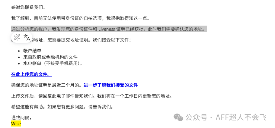 我就又重新开始了艰难的无护照激活wise探索了。我又尝试了一下,还是卡在上传护照,然后我就写信给wise的support团队,说我现在没有护照,要如何验证,然后收到了回信。