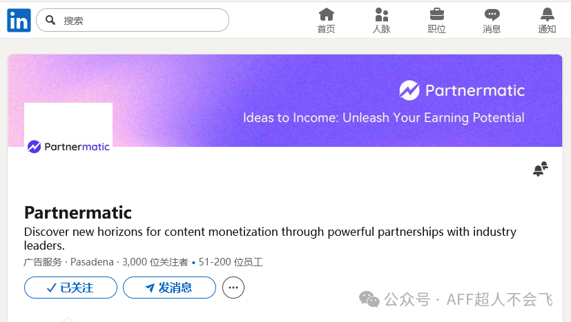 通过领英查看,Partnermatic公司办公室位于美国加利福尼亚州的帕萨迪纳市,不知道内地有没有办公室。不过不重要,我们主要看Partnermatic的affiliate相关的内容。
