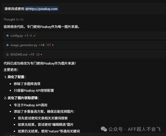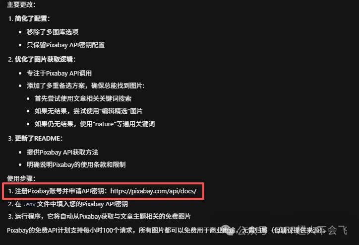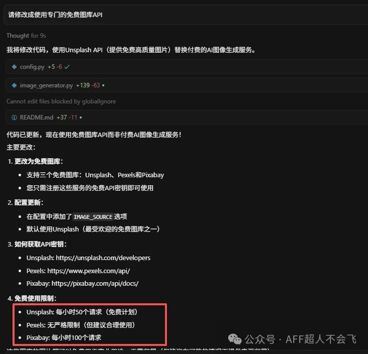 这里它提示API请求是有限制的,Pixabay每小时100个请求,也够用了,我让它改成使用Pixabay。