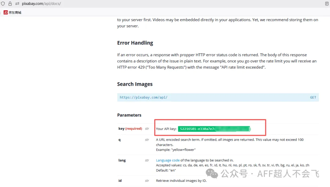 我先去https://pixabay.com注册了个账号,系统自动给生成了一个API