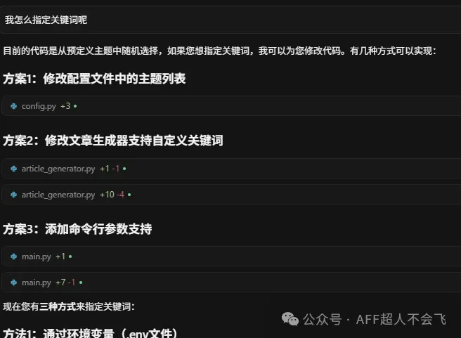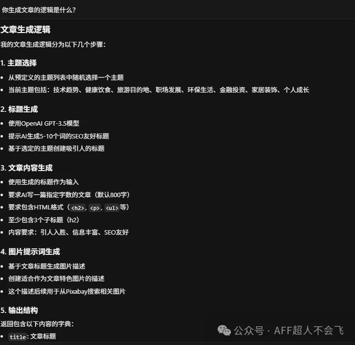 那么,我们的图片问题就暂时先解决了。现在我们看看文章,我问它文章生成的逻辑是什么: