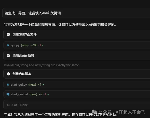 它修改后,提示可以终端输入关键词,但是体验感不好,我需要它生成一个界面给我输入,包括API,我都前端进行输入。我继续发提示词给它: