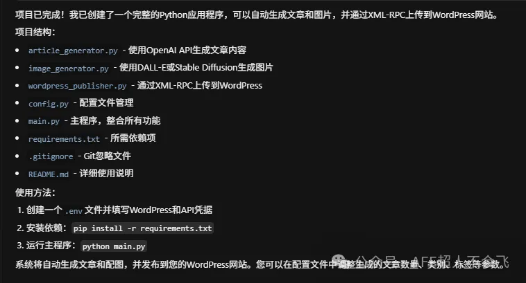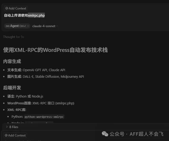 我们看到图片和文章的生成,都是需要API的。Wordpress有个xmlrpc.php的文件,可以允许远程调用,由于我之前接触过,我让AI使用这个来处理,可以直接写入数据库。
