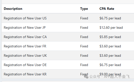 World of Warships这个offer呢,就是你想象中的那种好offer,我推广之前自己也手工测试了一两单,就是创建一个游戏账号,用户名邮箱密码,其他的不需要任何东西,然后,美国的就有6.75刀直接加上了。我们再看看单价表,像日本的,一个注册有12.6刀,我靠,这也太高了,这可仅仅是注册。