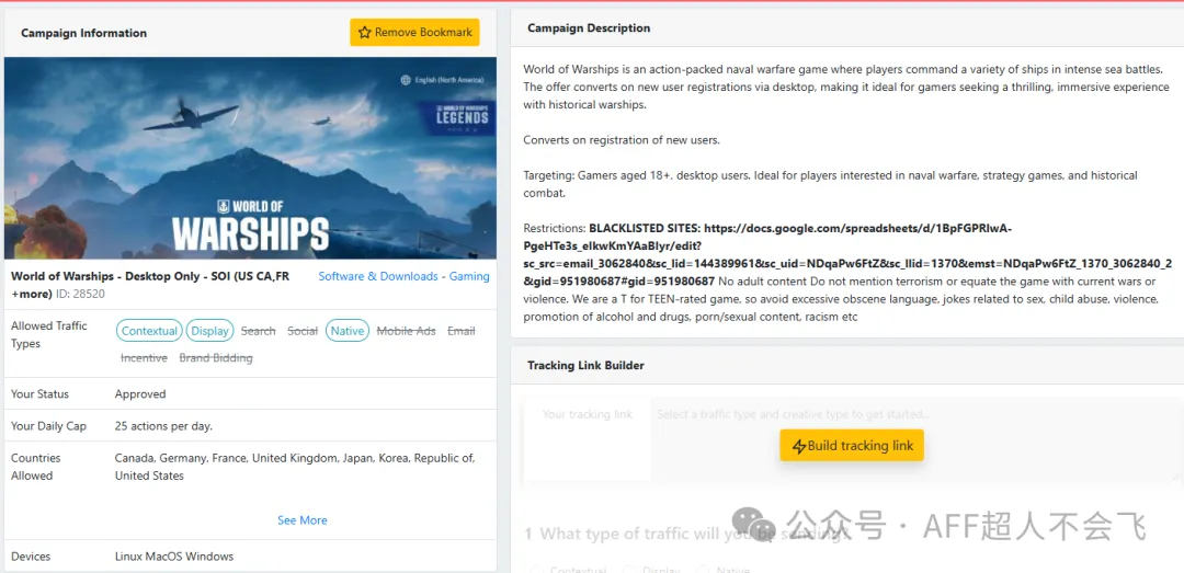 offer名称是World of Warships,我们可以看看它的要求:desktop,SOI,非常简单。为什么好呢,当然是相对其他offer来说了,前两天我吐槽了一个车险offer,几千个点击都没有转化,我自己去模拟注册也是卡住的,因为它还要同步填写车架号、手机号,这些跟我们普通的理解SOI类的offer是有差异的,我们一直认为SOI就是填写邮箱姓名等一下基础信息即可。