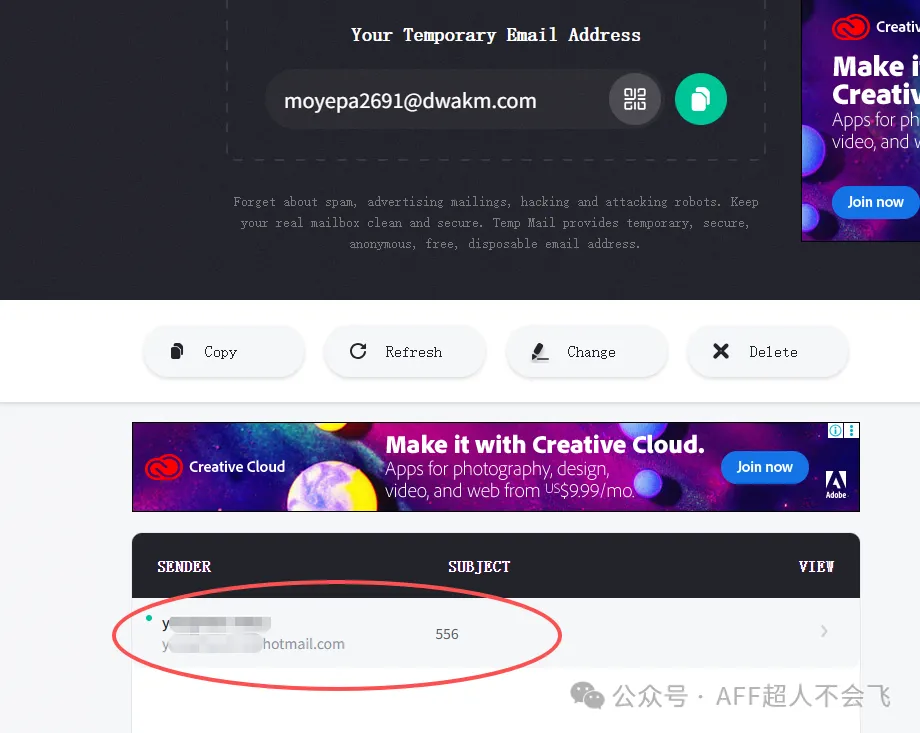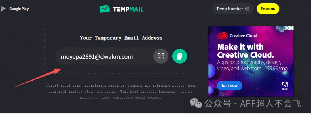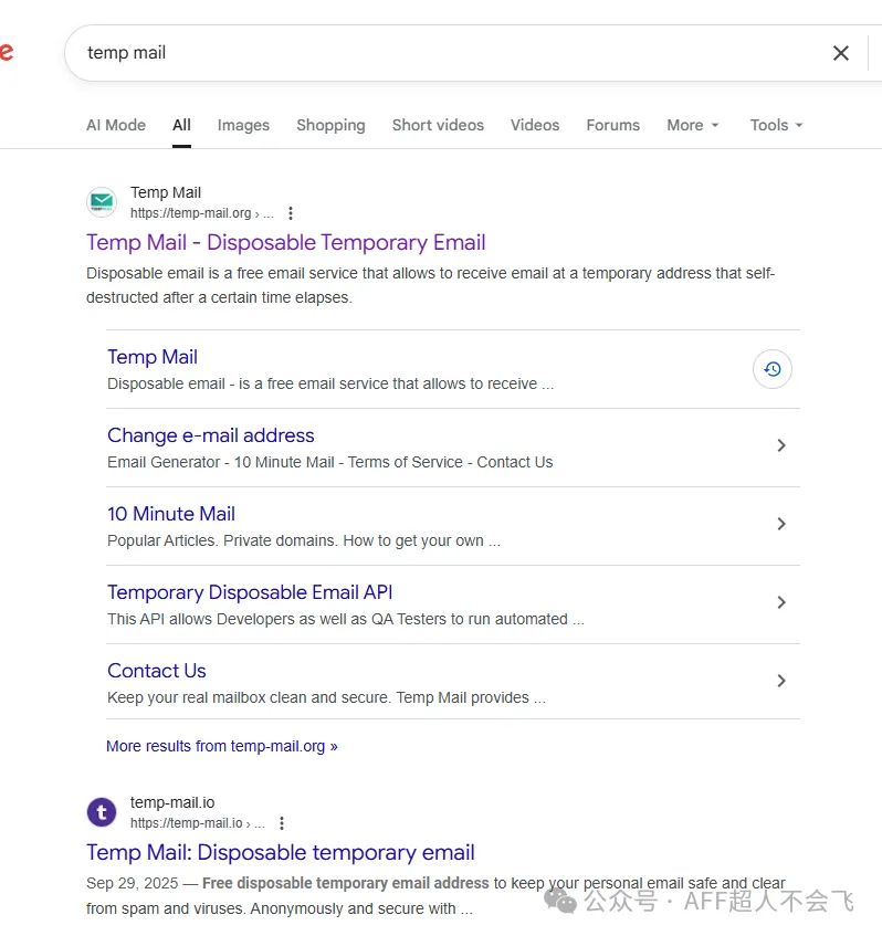 我们用谷歌搜索“temp mail”,就是临时邮箱,会返回很多结果。我们看看第一个,这里会随机生成一个临时邮箱给你