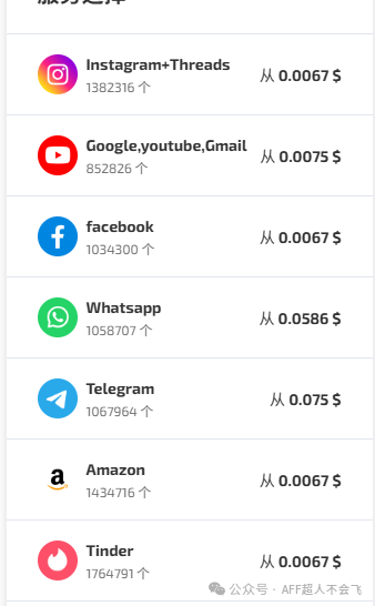 这个平台提供了很多服务,下图是支持的接码平台列表,我一般只用到了他的接码功能。除了谷歌外,个别联盟在申请的时候,也需要提供电话接码验证,也会用到它。接不到码是可以删掉的,不会扣费。