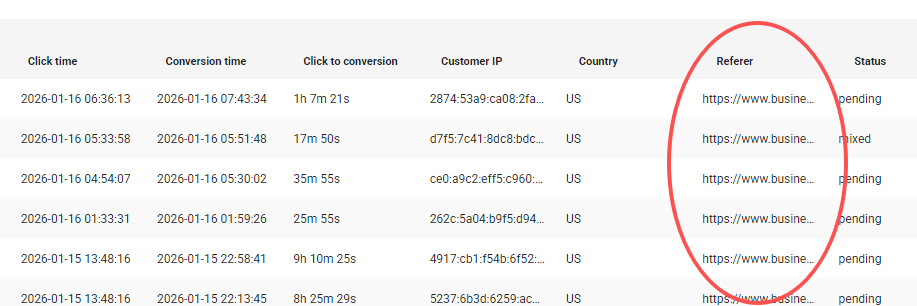 如下是我自己实测的,配置好Referral url后,某联盟后台统计出来的转化,显示了我们配置的Referral。