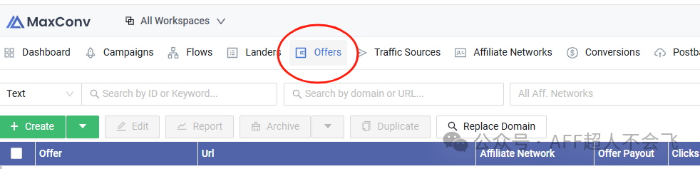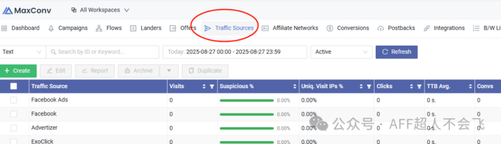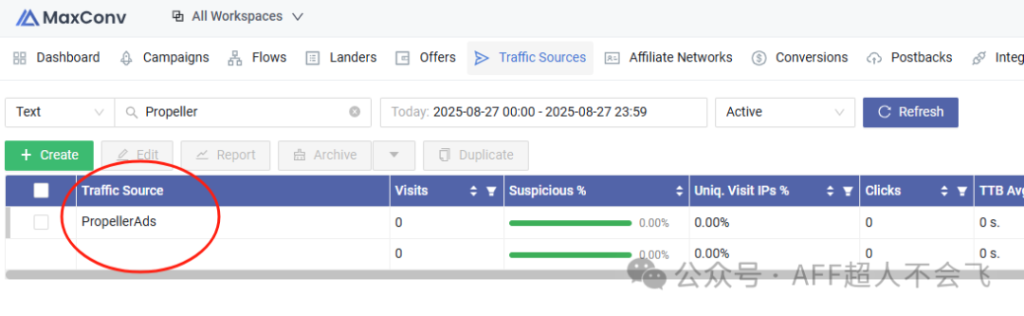 我们知道联盟营销有很多流量源,push、pop、ppc、native等等,流量源质量参差不齐,好的流量源直接能让ROI为负数的Campaign直接盈利。今天我们来使用一个现在公认的质量相对较好的流量源:Propellerads,并从头开始建一个Campaign。投放之前,我们要提前准备好的是offer、Landing page(直链的话不需要)和Tracking软件。Offer需要从你推广的联盟后台取,Landing page需要自己做。Tracking软件有很多付费的,像Maxconv,Bemob,binom等,都是当前主流的跟踪工具。我们以Maxconv为例,开始我们的操作。我们首先在Maxconv里创建Traffic source,直接点击Create,