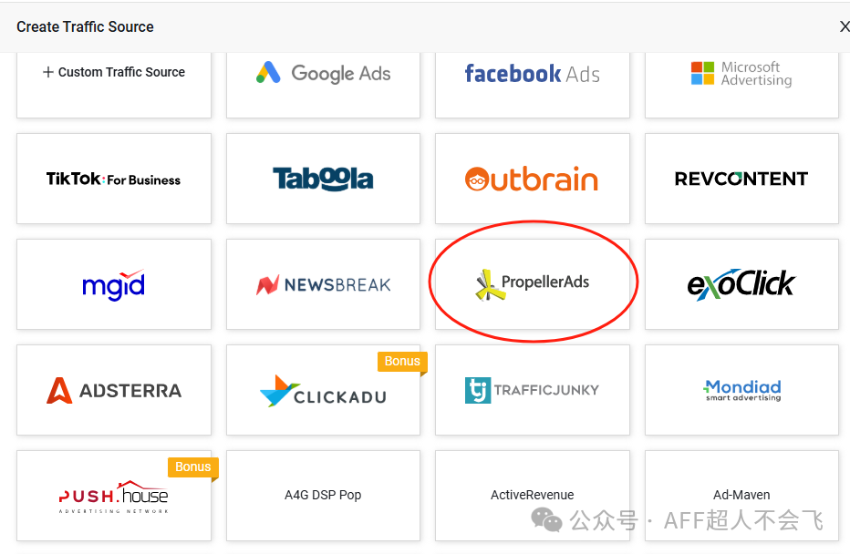 模版里已经集成好了常用流量源,我们直接选择Propellerads