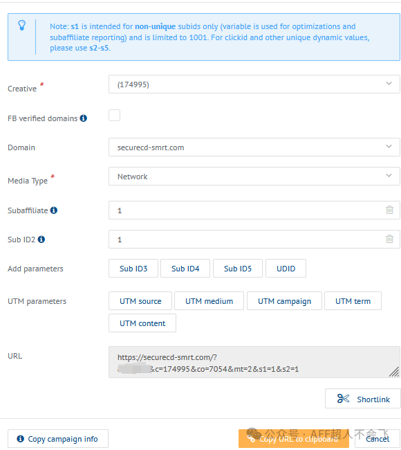 Affiliate Network里我们选Clickdealer。同时,在URL文本框里,添加我们的offer链接,并把s2的值替换成{mc_click_id}