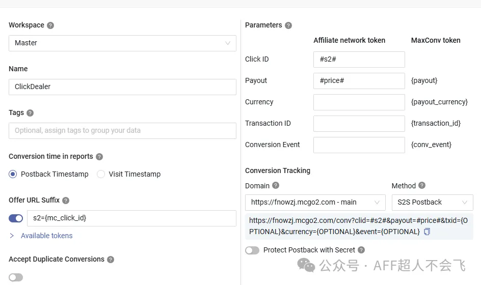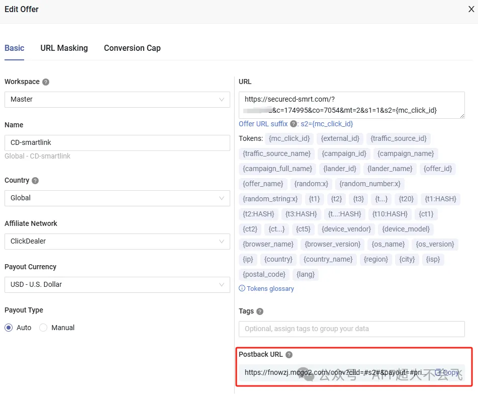 当然,我们还有一步操作没有做,我们需要把Maxconv的post back url放到CD的offer里去。我们重新打开offer界面,复制右下角的Postback URL。
