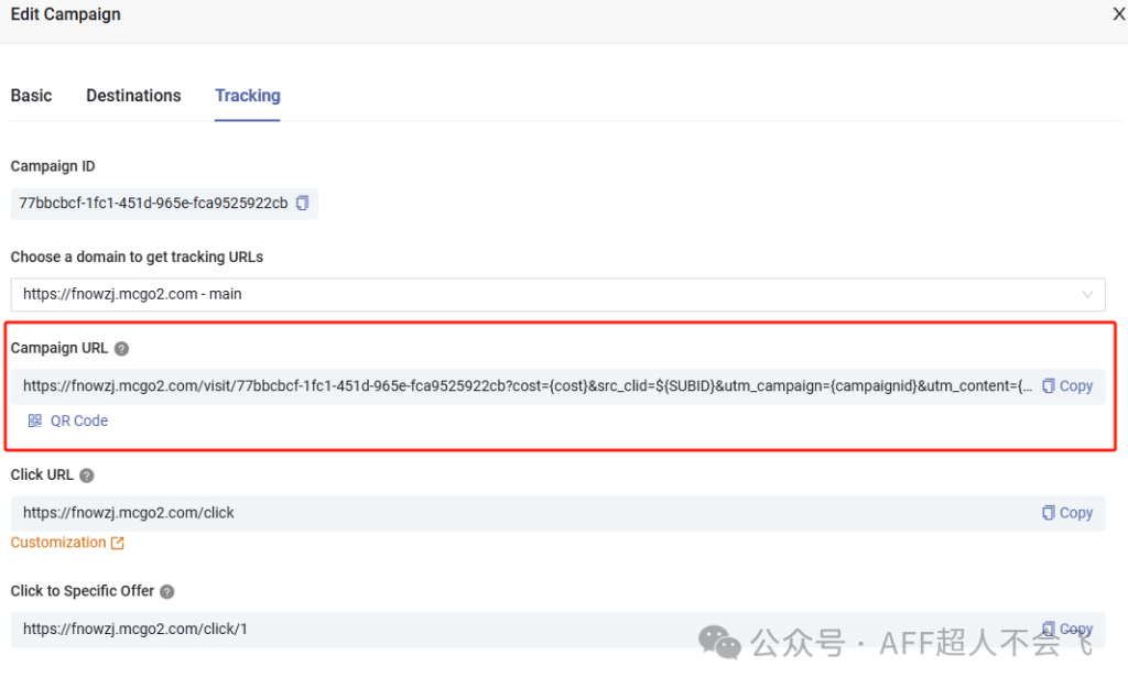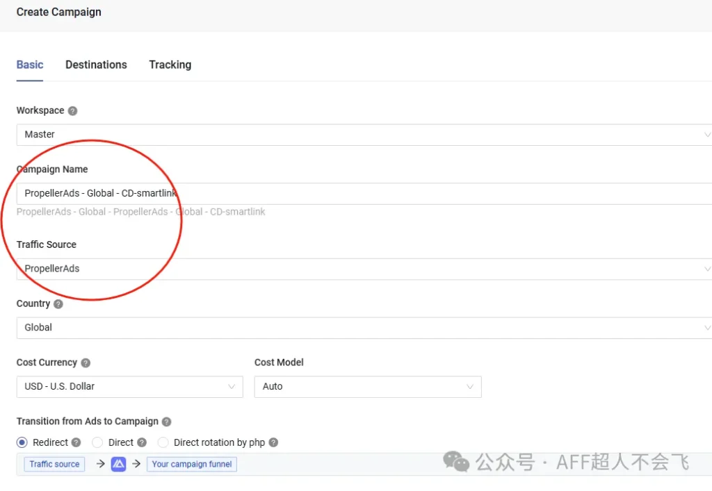 由于是测试,这个直链很快就会被拒掉,因为Propeller ads不允许此类直链,需要自己加上LP。Campaign完全建好了,那么我们还有一步操作,我们需要把转化回传到流量源,那么,需要在Tracking这里进行操作。这里默认的没有Maxconv,需要我们选择“other track or cpa network”,进行新建。