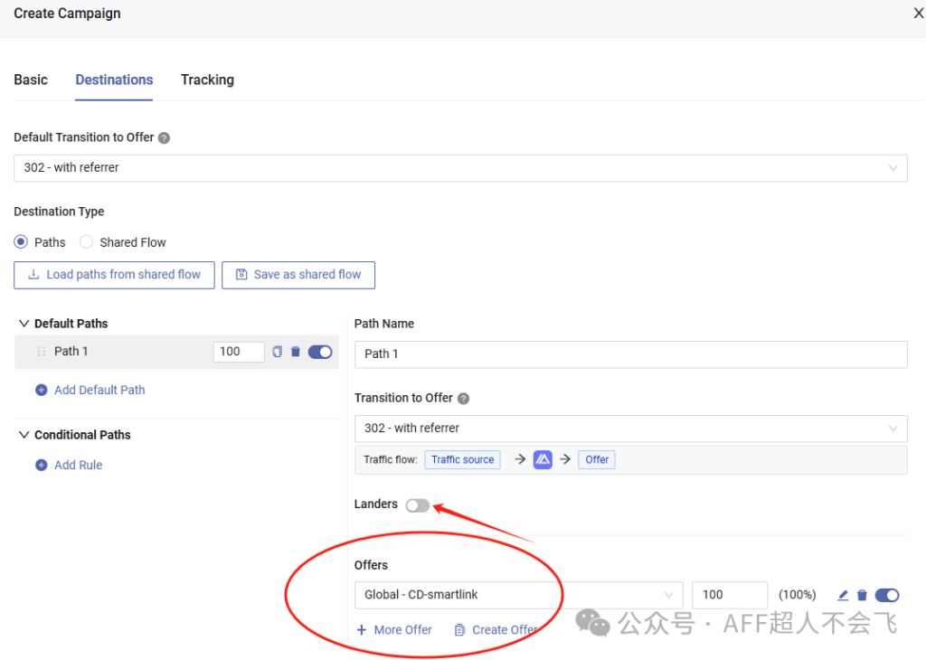 其他的都默认,在Destinations里,把Landers关掉,下面直接选刚才添加的offer。