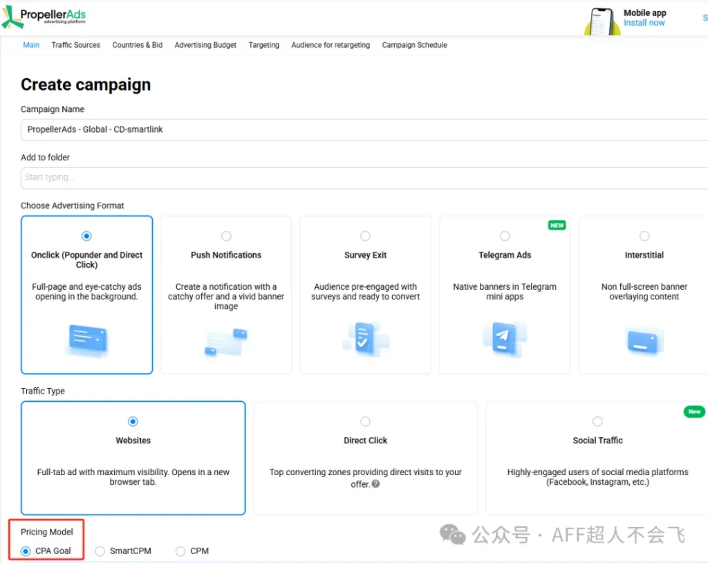 点击Create campaign,我选择pop流量,并使用它的cpa goal 模式,这样系统会根据转化来进行自动优化。