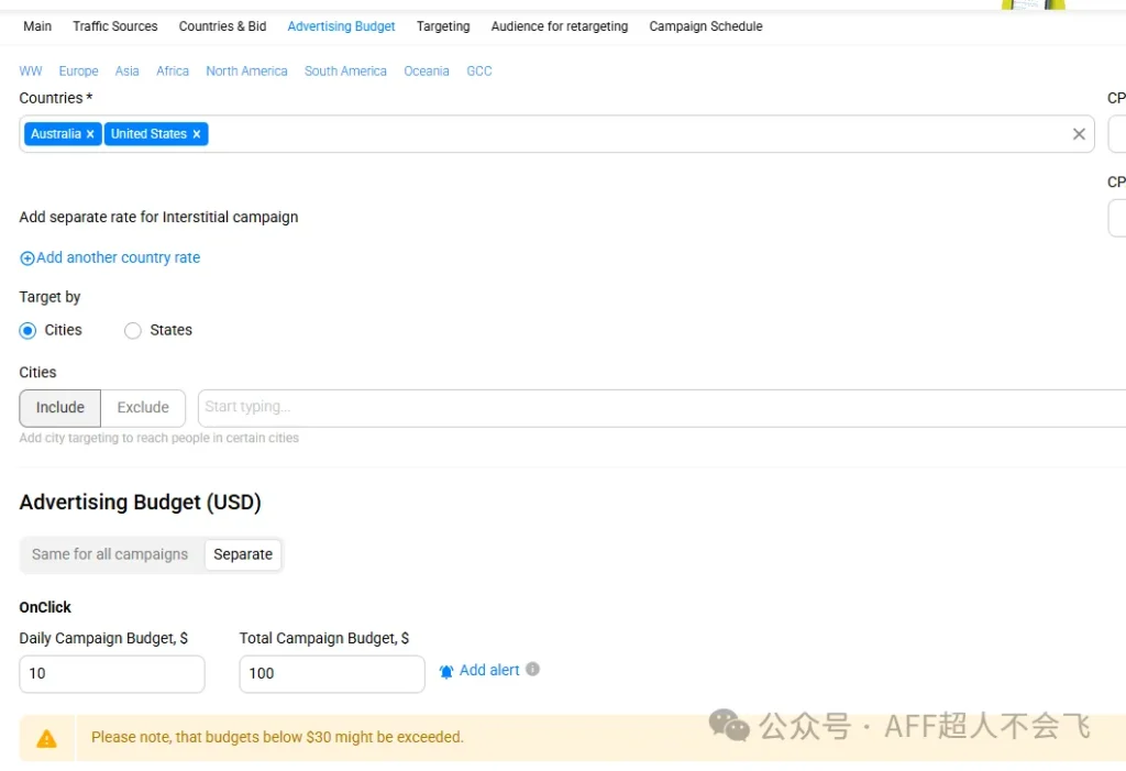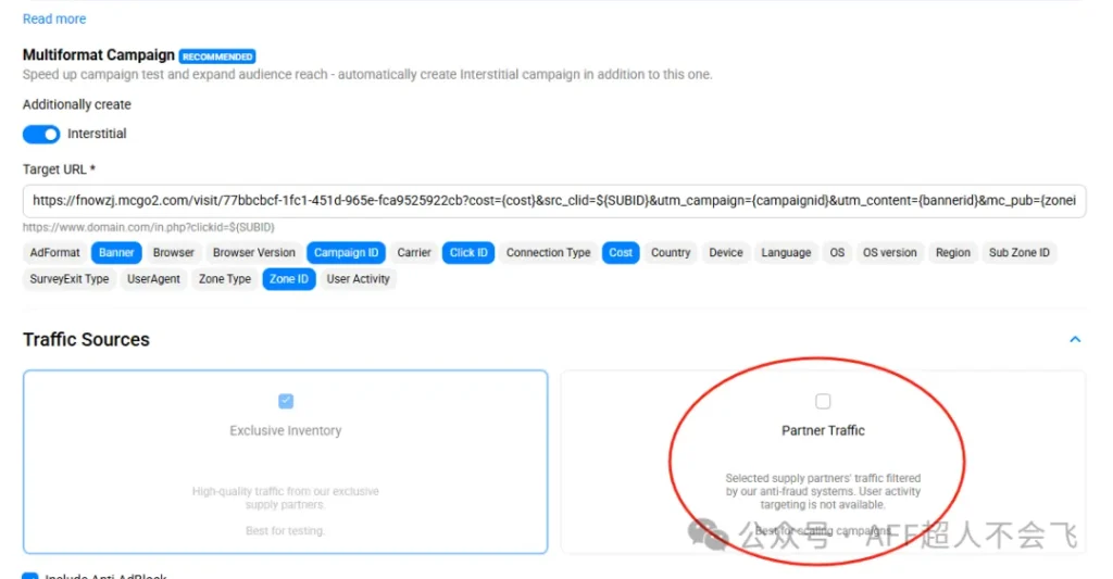 把我们刚才建好的campaign url复制到Target URL里去,同时,为了减少垃圾流量,Traffic source里不要勾选Partner traffic。