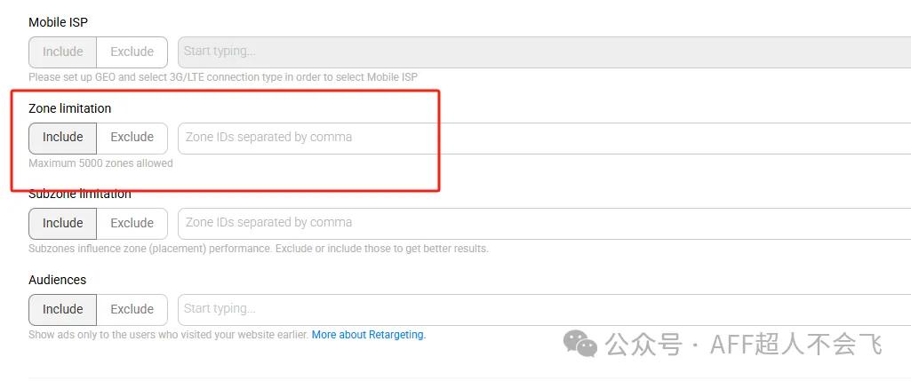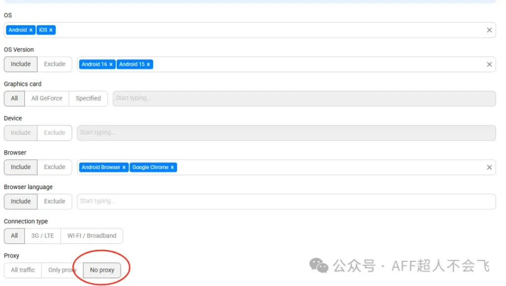 剩下的Targeting里,支持OS、ISP、Browser、Device等,还是比较详细的,Proxy这里我们选择No Proxy,可以过滤掉一部分垃圾流量。